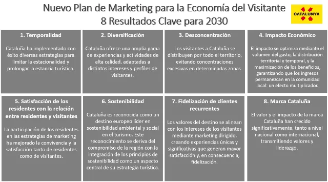 En materia de sostenibilidad, se promueve la limitación de la estacionalidad mediante campañas segmentadas y desarrollo de productos adaptados a distintas épocas del año, buscando prolongar la estadía media del visitante. Además, se impulsa la distribución territorial de los flujos turísticos para descentralizar la demanda de Barcelona y potenciar destinos del interior, los Pirineos y el Delta del Ebro.