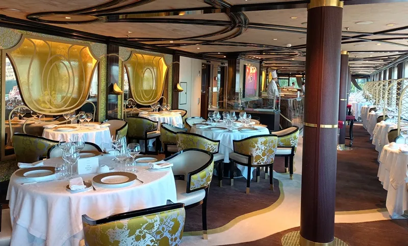 El barco tiene un Teatro, un Casino, un Spa y gimnasio, tiendas a bordo libres de impuesto, dos restaurantes principales, y 3 de especialidad, uno de comida asiática, uno de comida francesa y uno de carnes. La gastronomía obviamente está toda incluida y hay distintas opciones de restaurantes. Cuando se habla de que está todo incluido, en cuanto a las bebidas son todas etiquetas premium que se brindan en todo momento y en todo lugar. El servicio a la habitación, las 24 horas, son también de cortesía.