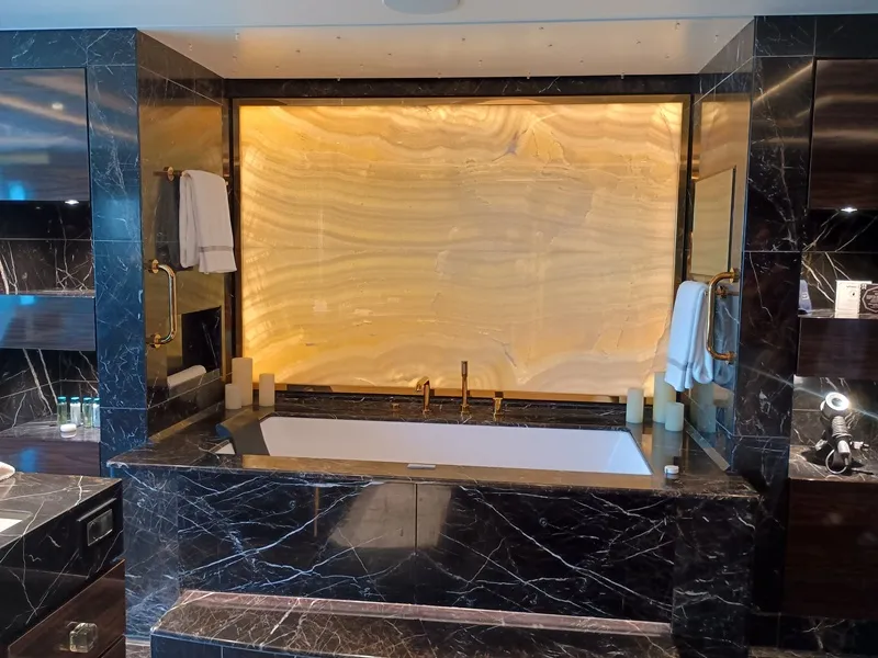 ¿Qué define al lujo en el turismo: la presencia de adornos de oro, piedras semipreciosas, maderas exóticas? posiblemente en muchos destinos y productos turísticos sea así, pero a bordo del Seven Seas Splendor, de la empresa de cruceros Regent Seven Seas, esa no sea la regla primordial. Por supuesto que hay lujo en sus materiales, la decoración y las amenities, pero el verdadero lujo está en el servicio personalizado, en la calidad de sus productos gastronómicos, la variedad de bebidas Premium, la superficie de sus suites, todas externas con balcón, la relación entre cantidad de pasajeros a bordo y los tripulantes, (que es de 1,3 pasajeros por tripulante), y por supuesto la inclusión de todas las comidas, bebidas, espectáculos y excursiones en tierra en el precio del crucero, Wi Fi ilimitado, propinas, lavado y planchado de la ropa, traslados entre el aeropuerto y el puerto y mucho más. Si pudiéramos compararlo con un hotel, seguramente podría clasificarse como un “6 Estrellas”.
