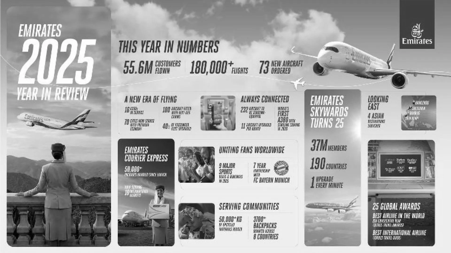 Este año, Emirates transportó a 55,6 millones de pasajeros, dio la vuelta al mundo 29.290 veces en 180.580 vuelos y realizó pedidos de 73 nuevas aeronaves. La aerolínea celebró en octubre su 40.º aniversario, pero la verdadera historia de 2025 va más allá de ese hito, ya que Emirates traza su visión sobre lo que realmente significa “volar mejor” en el futuro.