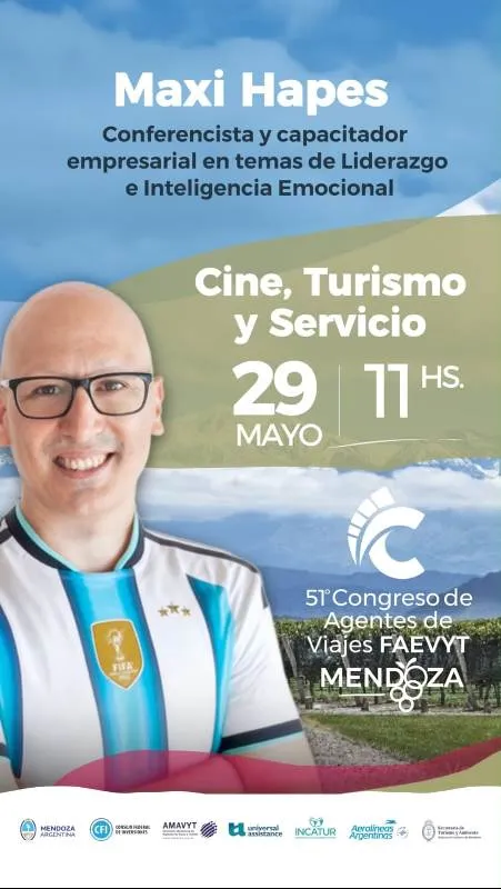 El 28 y 29 de mayo, Mendoza será sede del 51° Congreso de Agentes de Viajes de FAEVYT. En ese marco, se presentarán conferencias magistrales, talleres y actividades para los agentes de viajes de todo el país. Maxi Hapes brindará su conferencia magistral “Cine, Turismo y Servicios”, una propuesta innovadora que combina aprendizaje, reflexión y entretenimiento.