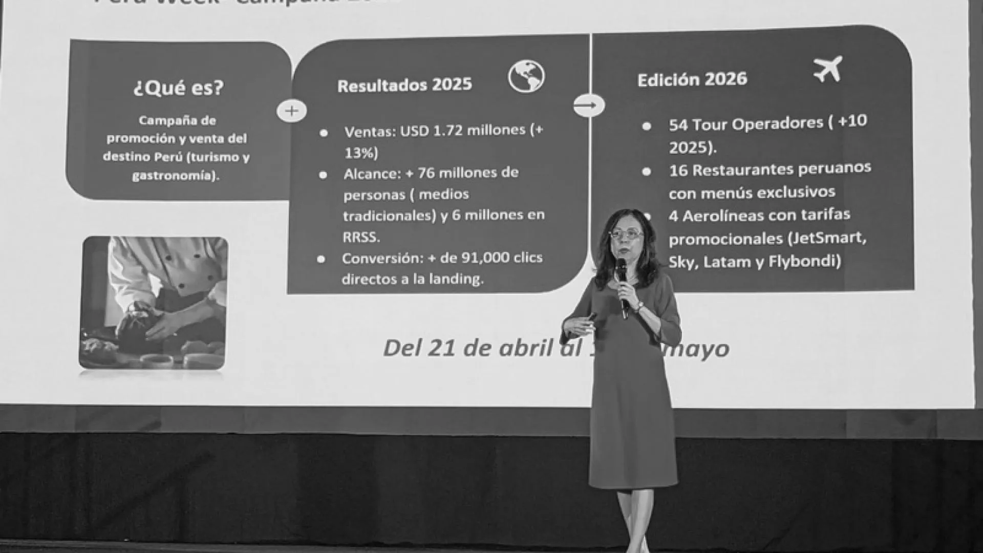 La directora de la Oficina Comercial de Promperú se dirigó a los presentes: “esta noche venimos a presentarles, no solo una campaña de promoción, sino una oferta de crédito, una invitación para que viajen y conozcan un destino cercano, diverso, multidestino, con muchas experiencias en sí mismo y que también es altamente competitivo para el viajero argentino, PerúWeek. Para mí es la primera vez que participo en esta campaña y me parece fabulosa. Es una iniciativa de PromPerú que engloba la promoción turística, las experiencias gastronómicas y culturales, todo en una sola plataforma”.