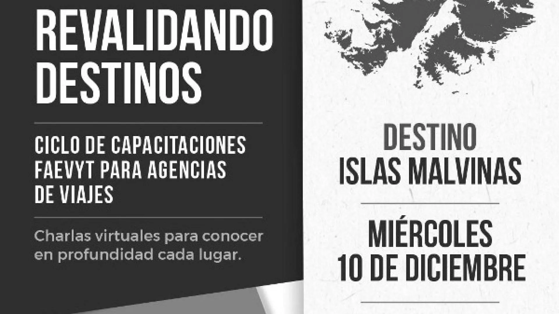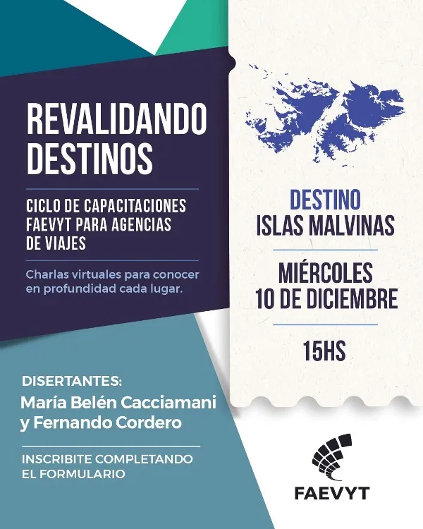 La Federación Argentina de Asociaciones de Empresas de Viajes y Turismo (FAEVYT) finaliza su ciclo de capacitación Revalidando Destinos, el próximo miércoles 10 de diciembre con las Islas Malvinas como último destino, una iniciativa federal, impulsada por la Comisión de Minoristas de la entidad, que recorrió de forma virtual todo el país para fortalecer el conocimiento profesional de las agencias de viajes. Se presentaron 26 destinos de todo el país con una participación de más de 3.000 agencias de viajes.