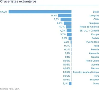 Cruceros de operación local: Este segmento comprende cruceros que operan de forma regular durante la temporada, conectando Argentina, Uruguay y Brasil, con movimientos de embarque, desembarque y tránsito en puertos argentinos.