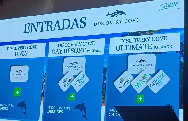 “En cuanto a Discovery Cove es algo único en Orlando. Es otro mundo. Son las vacaciones de las vacaciones de Orlando. Aquí no hay fila, aquí no hay ruido, es el único parque superexclusivo de Orlando. Solamente caben 1300 personas. Hay que hacer reservación previa. El 90% de lo que está en el parque está incluido. ¿Qué está incluido? El desayuno continental, el almuerzo buffet, todos los snacks que se quieran comer incluyendo vino y cerveza para mayores de 21 años, Le vamos a dar el equipo de snorkel, le vamos a dar el bloqueador solar para que no dañe los animales, las toallas y hasta el estacionamiento”.