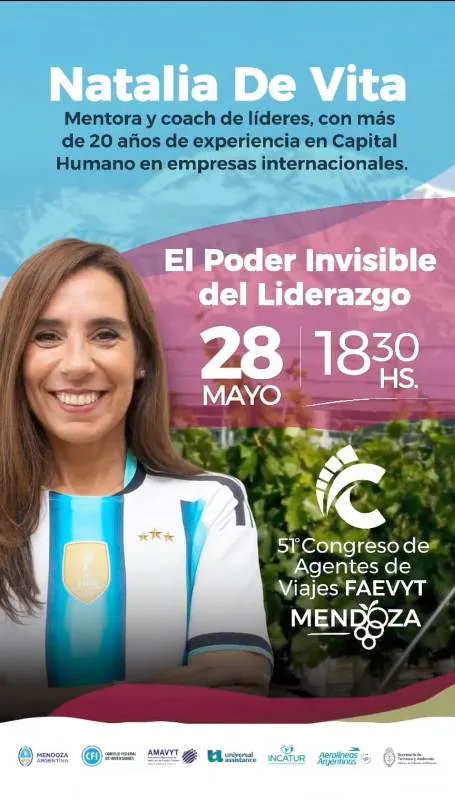 El 28 y 29 de mayo, Mendoza será sede del 51° Congreso de Agentes de Viajes de FAEVYT, que se llevará a cabo en el Auditorio Ángel Bustelo. En este marco, Natalia De Vita será una de las conferencistas destacadas con una propuesta enfocada en repensar el rol del liderazgo en contextos actuales.